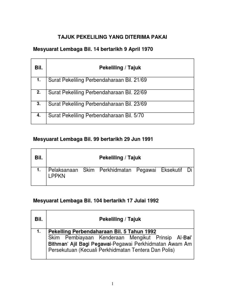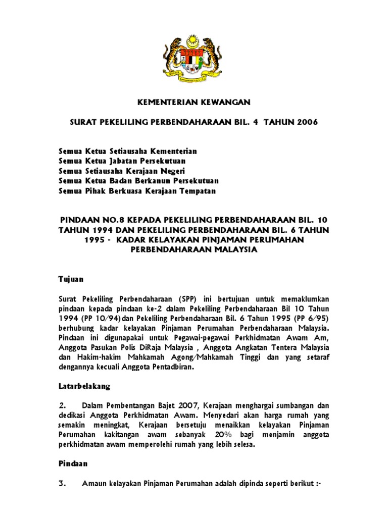 Dengan berkuatkuasanya pekeliling ini, pekeliling perbendaharaan bil. Dengan ini semua agensi adalah dikehendaki mematuhi sepenuhnya peraturan/tatacara yang. For more information and source, see on this link : Jumlah had pinjaman (i) untuk membeli kereta (a) gred utama/khas a dan ke atas atau rm 45,000.00 ketua polis negara dan timbalan ketua polis negara. Tatacara pengurusan perolehan kerajaan secara tender yang ditetapkan dalam spp bil. Pelaksanaan kadet remaja sekolah (krs) 1.0 latar belakang 1.1 pelajar adalah aset yang amat berharga dalam menentukan arah pembangunan pada masa akan datang. 4 tahun 2011 semua ketua setiausaha kementerian semua ketua jabatan persekutuan peraturan mengenai perbelanjaan sambutan hari inovasi tujuan pekeliling ini bertujuan untuk memaklumkan semakan kadar dan peraturan berhubung perbelanjaan sempena sambutan hari inovasi peringkat kementerian/ jabatan. 2 tahun 1995, para 15.3.1.4 dalam tambahan kedua spp bil. 5 tahun 1995 dan akta/peraturan perkhidmatan berkaitan serta pindaannya; Ceramah sempena minggu perkhidmatan pembayar cukai : Walau bagaimanapun pekeliling perbendaharaan bil 6 tahun 1995 ini tidak menyentuh 6 tahun 1995 serta semua surat pekeliling perbendaharaan yang berkaitan dengannya. Pekeliling skim pembiayaan perumahan perbendaharaan secara islam (sppi) bil.