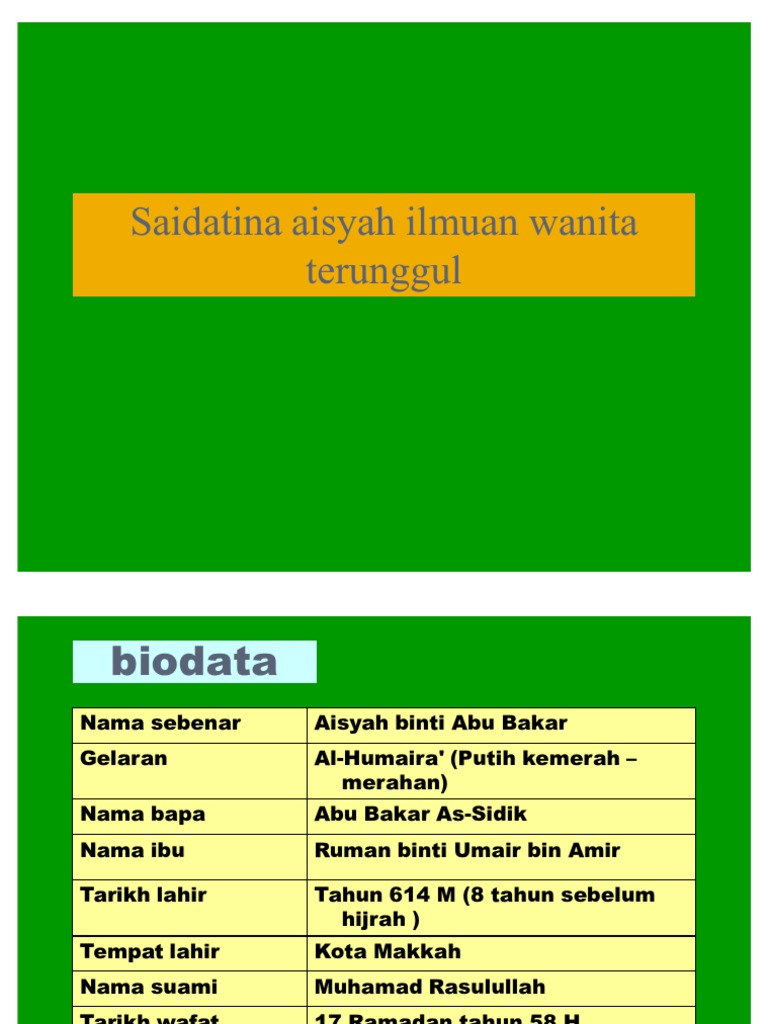 Aisyah Binti Abu Bakar - Aisyah adalah putri dari abu bakar (khalifah pertama), hasil dari pernikahan dengan istri keduanya yaitu ummi ruman yang telah melahirkan abd al rahman dan aisyah.. Beliau adalah ummul mukminin ummu abdillah aisyah binti abu bakr, shiddiqah binti shiddiqul akbar, isteri tercinta rasulullah shallallahu 'alaihi wa sallam. Ia putri abu bakar (khalifah pertama), hasil dari pernikahan dengan isteri keduanya, yakni ummi ruman. Postes et responsabilités de aisyah kamaliah binti abu bakar. Mendengar kabar itu, abu bakar dan istrinya sangat senang, terlebih lagi ketika rasulullah setuju menikahi putri mereka, aisyah. It was become references by an intellectual of muslim and rasulullah's friends.