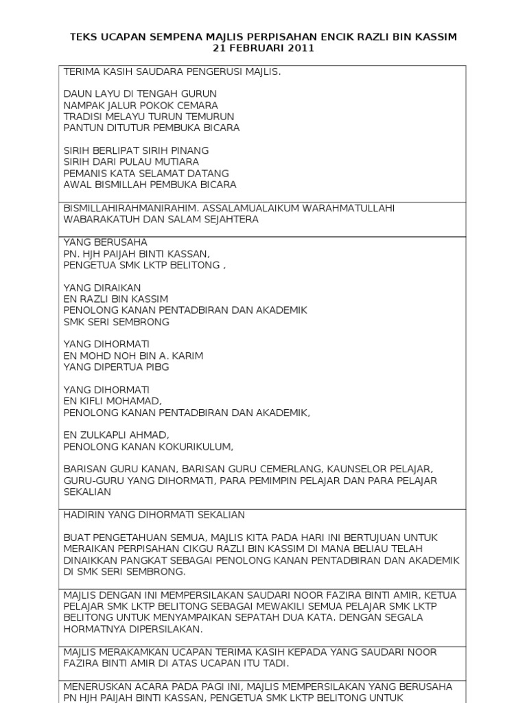Yb dato' seri mohamed azmin ali menteri kanan. Draf ucapan perasmian majlis anugerah cemerlang dan mesyuarat agung pibg smk cheras jaya tahun 2009. Majlis perpisahan persaraan saya dengan rasminya telah dibuat oleh pihak sekolah menengah kebangsaan sultan ibrahin satu, 17000 pasir mas, kelantan pada 28 februari, 2013 ( khamis ), bertempat di dewan besar sekolah yang bermula pada jam 12.00 tengah hari hingga jam 2.00 petang. Graduan wajib memakai jubah yang disediakan oleh pihak pusat dengan mengikut tertib seperti berikut: Majlis persaraan pegawai pendidikan merupakan sebahagian tatacara operasi piawai atau s.o.p.